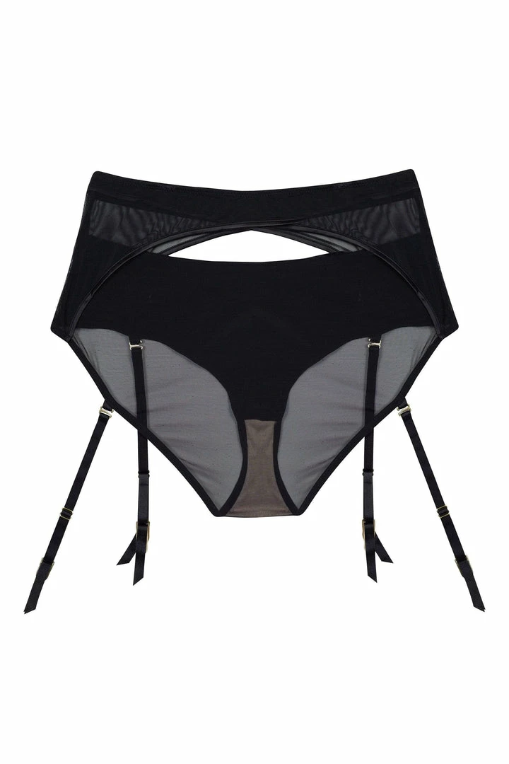 Simple, sophisticated, but highly erotic, the Charlie highwaisted brief in sleek black satin features sheer panelling and cut out detailing. With detachable suspender straps this set is definitely a boudoir essential.