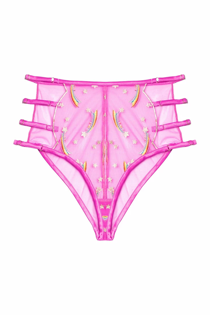 To celebrate Pride 2022, Playful Promises designed the ‘Love is Love’ capsule collection. We named the collection after leading LGBTQ figures throughout history. This set is named after Jaqueline Charlotte Dufresnoy, or Coccinelle, who was a transgender French actress and singer. She was known as the first widely publicised gender reassignment case in Europe. Featuring pink sheer mesh with a pretty rainbow and shooting star embroidery, it has pink satin edging and caged hip details for extra sass. Match with our Coccinelle Bra and Suspender Belt for the full look.