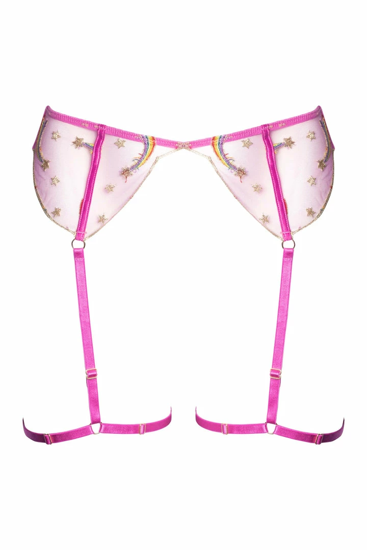 To celebrate Pride 2022, Playful Promises designed the ‘Love is Love’ capsule collection. We named the collection after leading LGBTQ figures throughout history. This set is named after Jaqueline Charlotte Dufresnoy, or Coccinelle, who was a transgender French actress and singer. She was known as the first widely publicised gender reassignment case in Europe. Featuring pink sheer mesh with a pretty rainbow and shooting star embroidery, it has pink satin edging and leg strap details for extra sass. Match with our Coccinelle Bra and Brief for the full look.