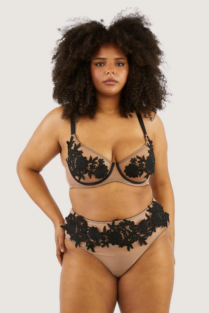 Alaina is bound to raise pulses. It provides a stunning illusion with black floral guipure appliqué over transparent beige mesh.The Briefs are high-waisted which hugs your curves in all the right places. For a complete set, pair with the Alaina Bra and Suspender Belt.