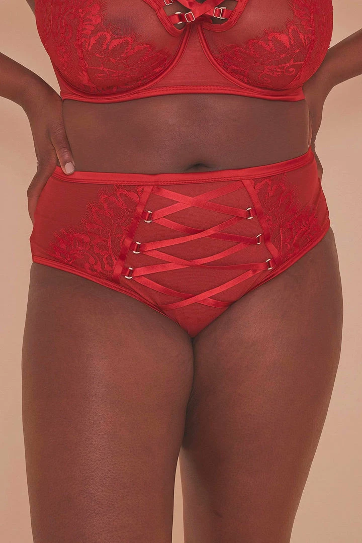The red lace up high waist knicker is the perfect sidekick to the red high apex bra, it’s the little red number everyone needs.