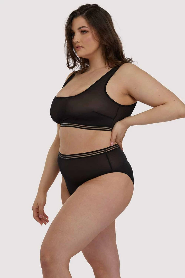 Be eye-catching in our Chelsea Black Mesh Highwaist Brief. These Briefs are lined with a black mesh and finished with stripy elastic detailing. The high-waisted design hugs your curves and gives you that hourglass figure. Pair with our matching Crop Top to complete the set.