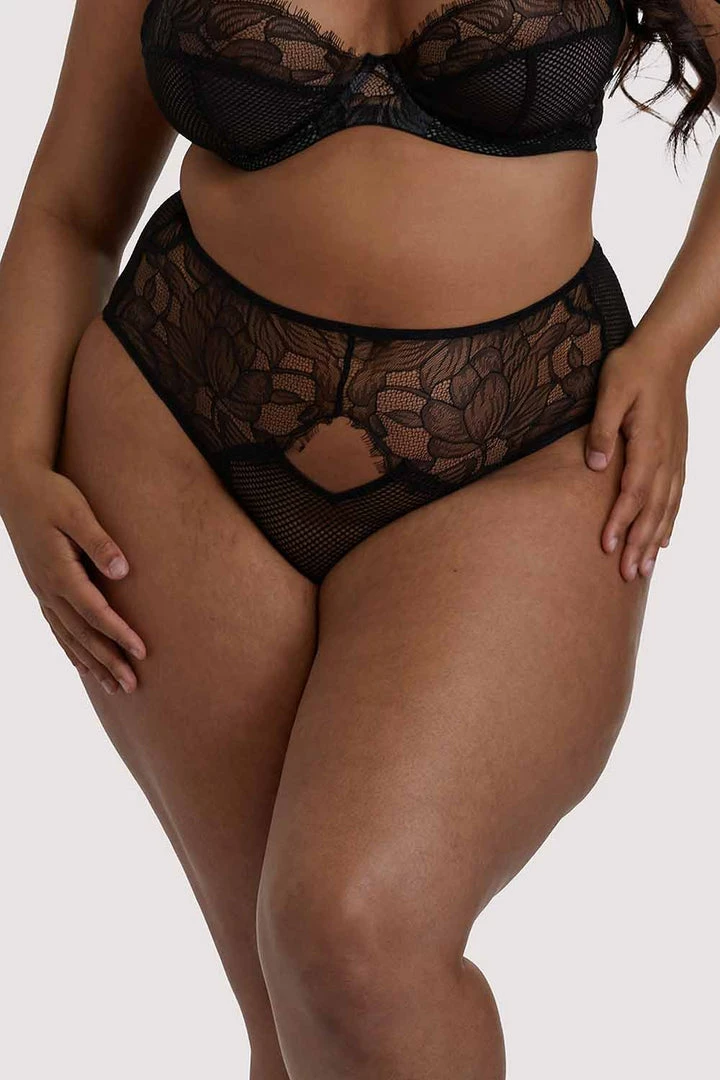 Be flirty in floral…Our Khloe Black Floral Highwaist Briefs are subtle but sexy. They are constructed of Black fishnet mesh with flirty floral lace detailing on the front, there is also a key hole feature in the centre. Pair with our Khloe Bra and Suspender for the ulrimate look.