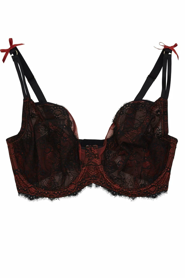 Ezmae is the perfect lingerie-drawer staple! Sheer rust red mesh is completely overlain with black lace and a sheer mesh edging.