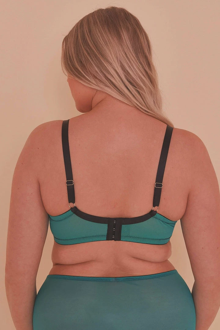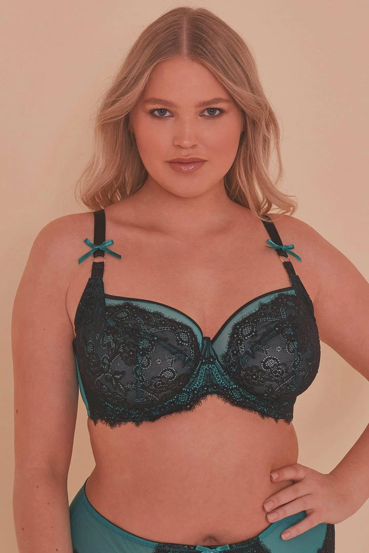 Ezmae is back! The perfect lingerie-drawer staple! Sheer teal blue mesh is overlaid with beautiful patterned black lace and sheer mesh edging.