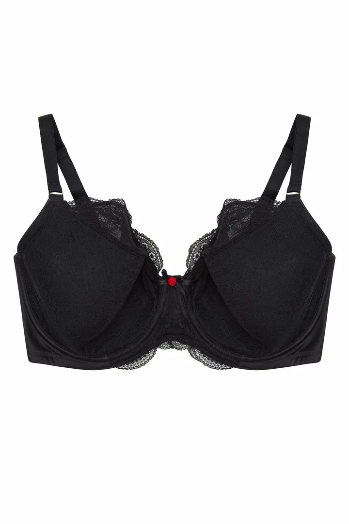Fion is another addition to our Fuller Bust Collection. Anything but basic, this black bra features a decorative lace that is backed by a slightly padded cup, and sitting with no backing on top of the cup to reveal it’s pattern. A red rose and bow sit in the middle to decorate.
