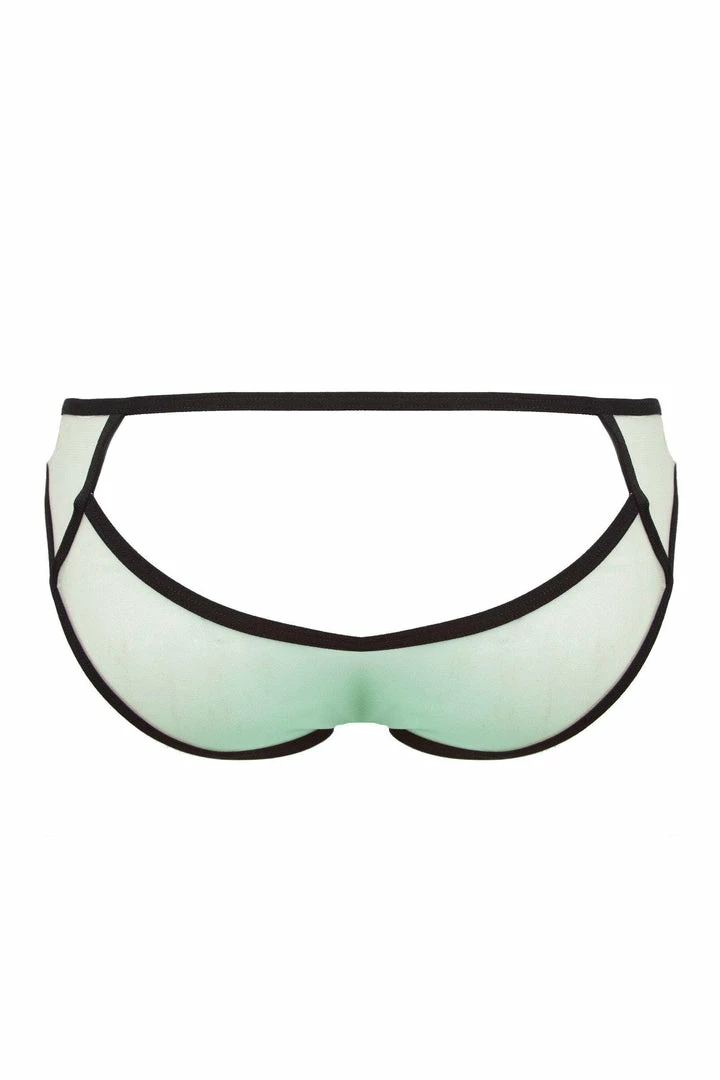Flirt with classical romance in our Hedy range. Charm in our classic Brazilian cut brief with a tempting surprise! Our Hedy brief features an elegant lay of symmetrical black eyelash lace over mint green stretch satin.