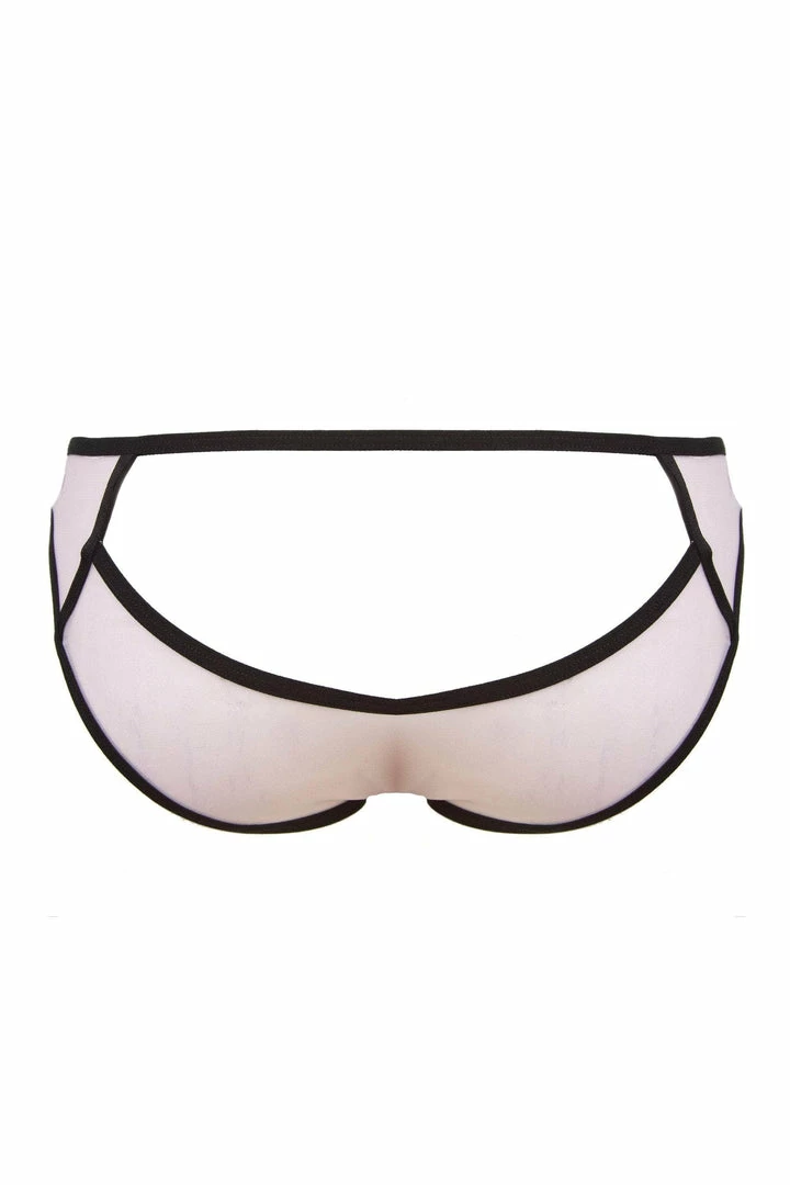 Flirt with classical romance in our Hedy range. Charm in our classic Brazilian cut brief with a tempting surprise! Our Hedy brief features an elegant lay of symmetrical black eyelash lace over peach stretch satin. Turn around for a surprise of the cut-out peek-a-boo behind finished with a darted downwards seam to enhance the sweetheart shape of your bottom – our Hedy brief is sure to leave a lasting impression. The peek-a-boo brief is skirted with power mesh for a flirty, yet comfortable wear.