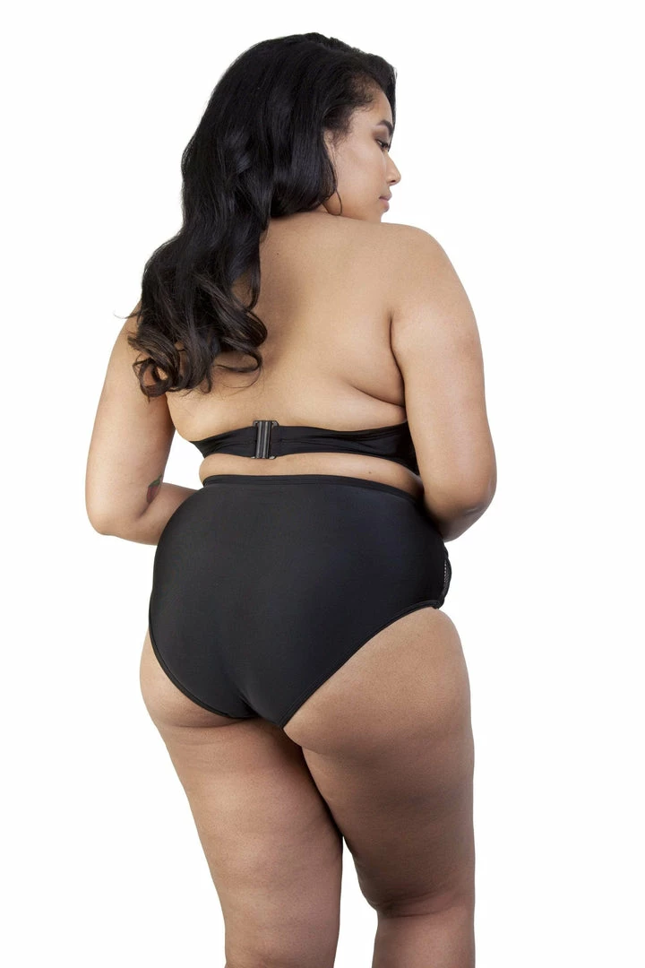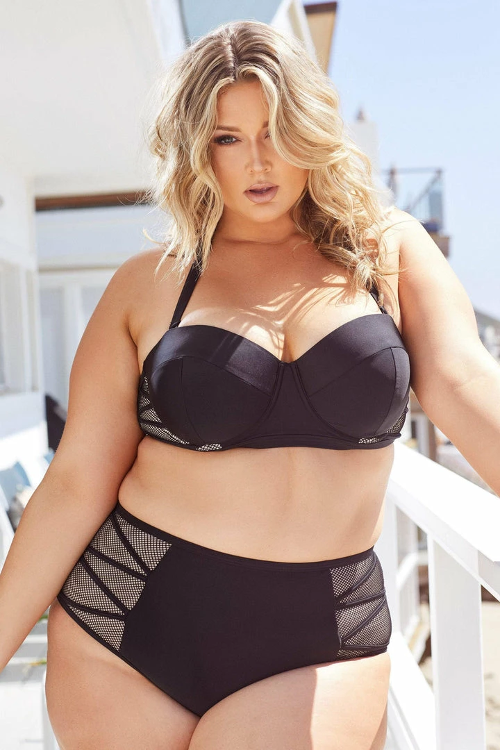 Channel your inner vamp in this curvaceous number! This full-coverage bikini top features sturdy three-panel construction on the cups, reinforced with another double layer of mesh inside. The edges are trimmed with a wide net fabric covering caramel-coloured mesh base. The bikini top is further adorned with a criss-cross strap detail along the sides. The bikini fastens with a plastic closure on the back and removable ties behind the neck.