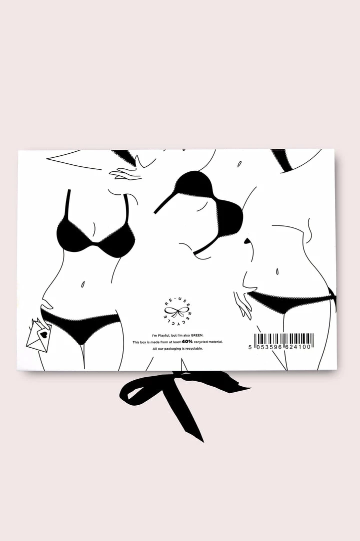 For an extra special treat, opt for our gift Illustrated Gift Box option! Your lingerie will be wrapped in Playful Promises tissue paper and placed inside the box, which is tied together with black ribbon. The box is posted out in it’s own cardboard box to ensure there is no damage.