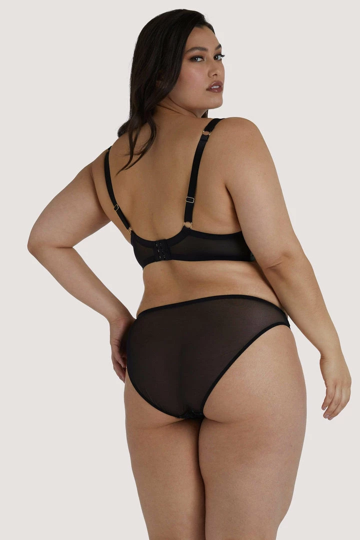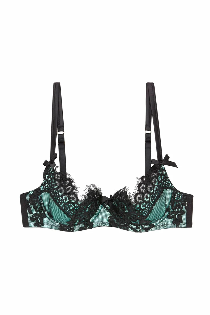The Jaquelina Contrast Quarter Cup Bra features bold floral lace overlaying matte mint green satin. The quarter cup style looks gorgeous with pasties, or nothing at all! The bra is embellished with a black bow between the cups and on the apex. The fresh-yet-flirty vibes of this set are sure to get you in a good mood!