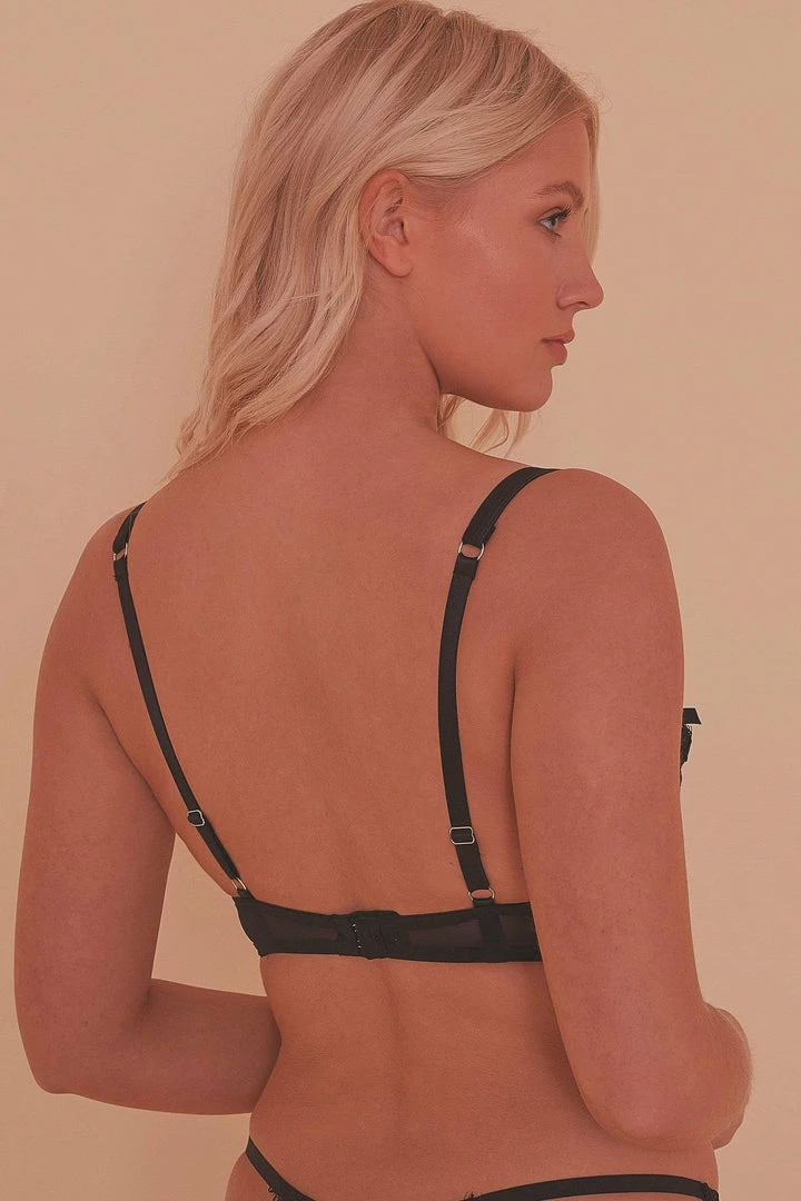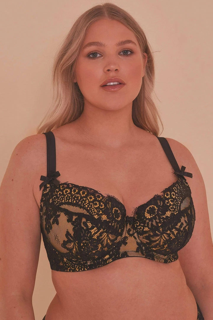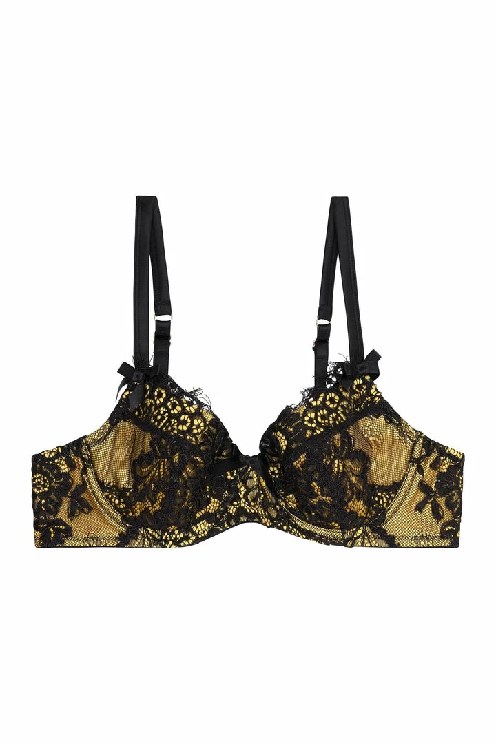 The Mustard Contrast Plunge Bra features bold floral lace overlaying matte yellow satin. The bra is embellished with a black bow between the cups and on the apex. The sunny-yet-sexy vibes of this set are sure to get you in a good mood!