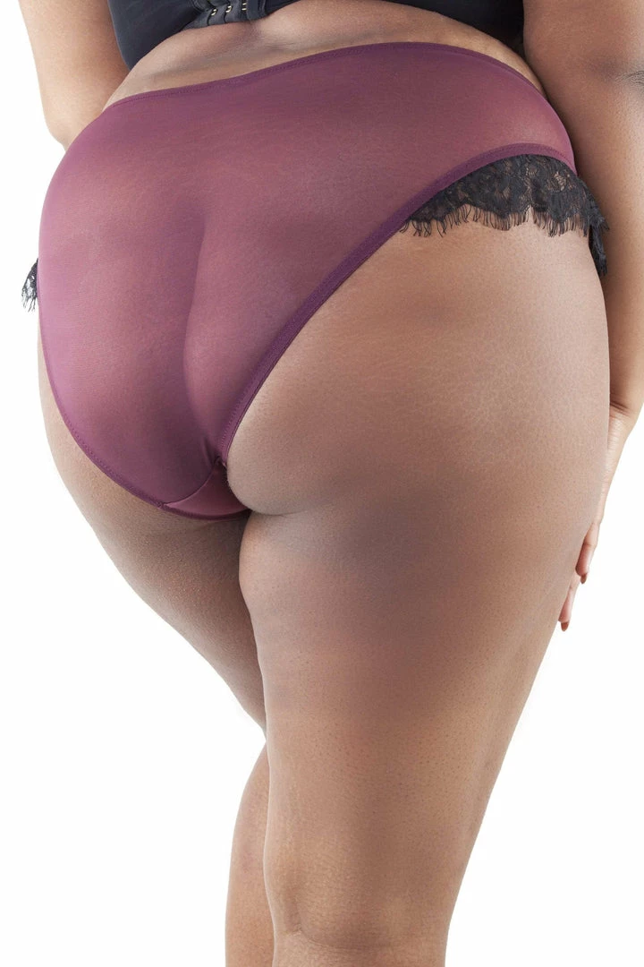 Vamped up with a wine red hue, the Karine brief features black eyelash lace, skirted around the leg for a feminine touch to a beautifully classic brief style. The sheer mesh back and sides add a sexier touch, completed with a velvet bow and teardrop-shaped gem in the centre.