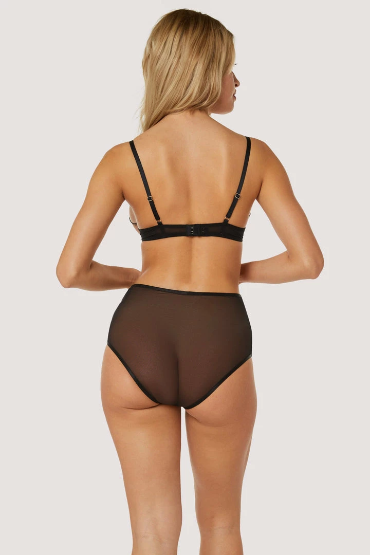 Grrr! Tiger is back… this time in Peach and Black. These High Waisted Briefs feature soft peach sheer mesh embroidered with black tigers and floral designs with caging details on the hips. Match with the Tiger Peach and Black Bra for the ultimate set.