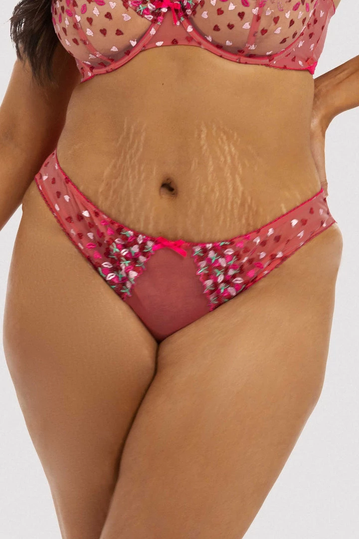 Feel playful in our Cherry Embroidery Coral Brief. Crafted from pink sheer mesh with intricate hearts, lips and cherry embroidery on top for extra sassiness. Match with our Cherry Plunge Bra and our Suspender Belt for a sassy set of dreams.