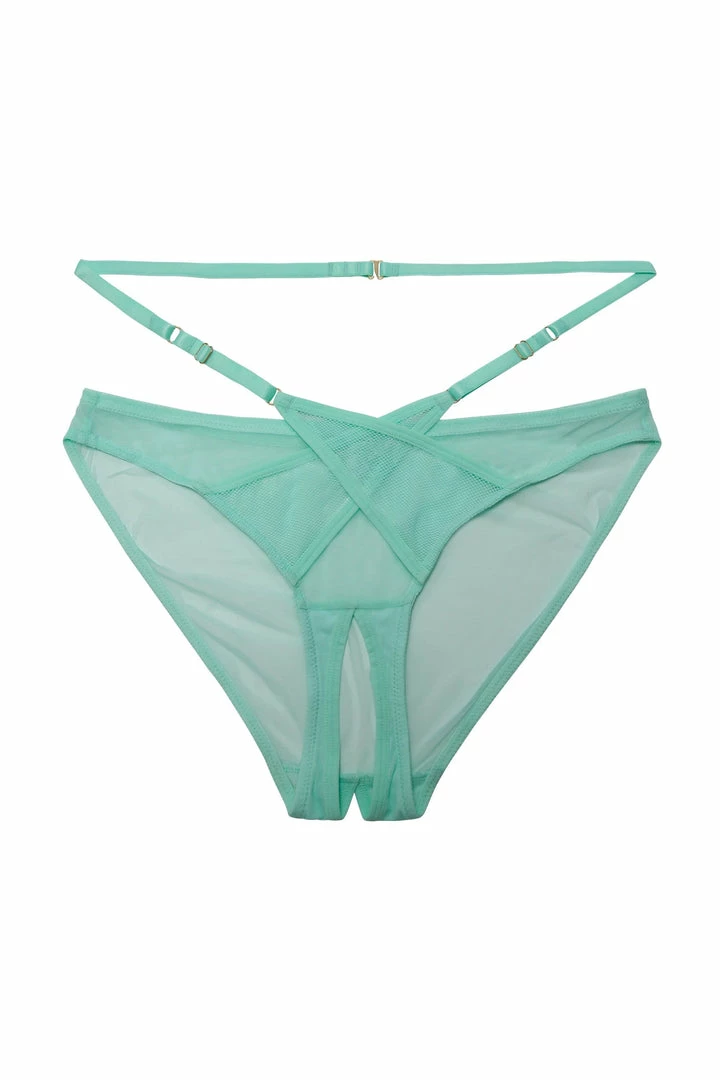 Eddie is bright, bold and a serious statement-maker. Your favourite ultra-strappy set is back! Featuring aqua mesh with fishnet panels and satin elastic harness detail. Complete the look with the matching bra.