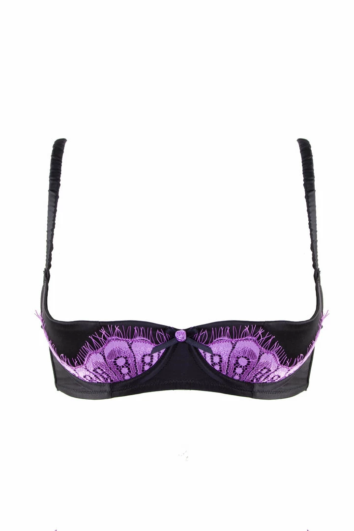 In a sexy, timeless black satin, with quarter cups encased in eye-catching bright lilac eyelash lace, the Marlene is perfect for pairing with pasties, or nothing at all. The ever-so-slight padding creates a sensual lift and contour, and features a little bow and rose detail in the centre. The Full Bust bra features stronger mesh on the band and thicker ruched detail straps for added support. It fastens with hooks and eyes at the back.