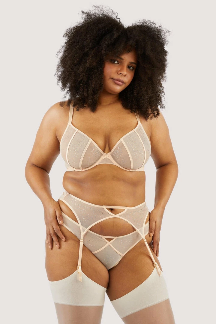 Introducing the Nola Toffee Diamante Studded Suspender. This angelic new set comes in a yummy light toffee colour, and features an array of dainty diamantes on a delicate mesh. The suspender also features a beautiful triangular cut out in the centre, a perfect match to the brief and thong.