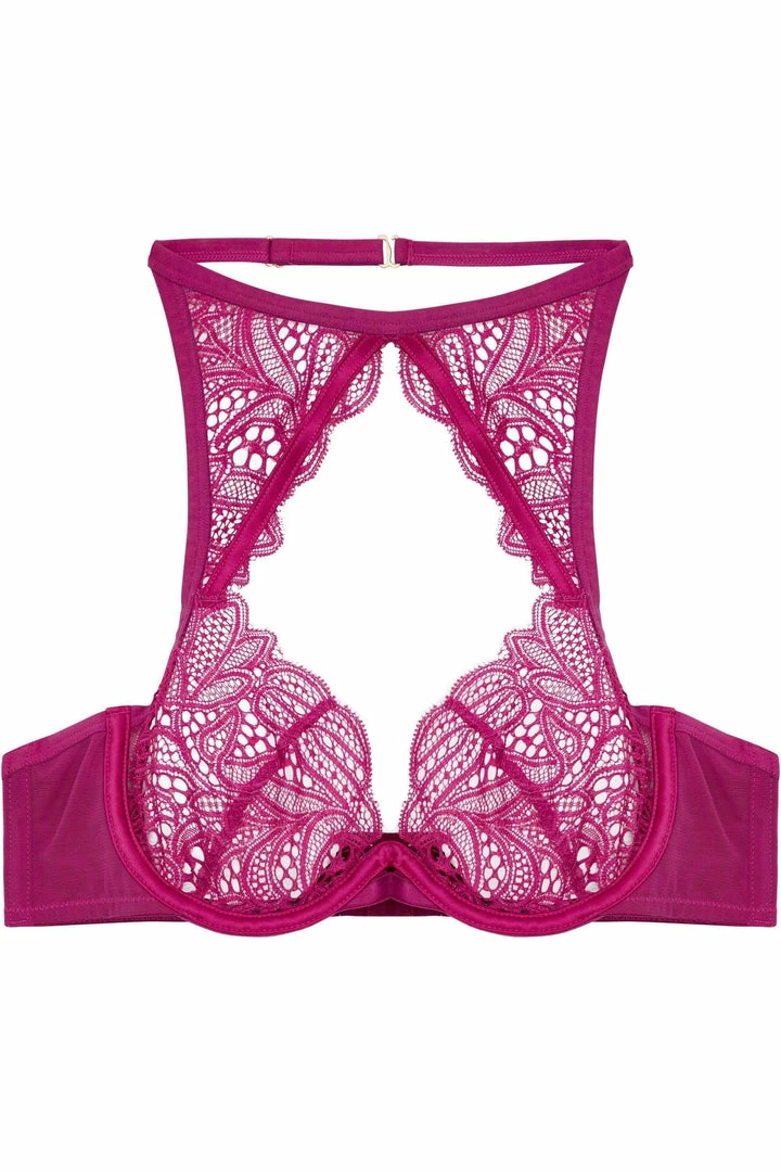 Pretty in pink <3 Claudia is fun and unique. The high neck style features see-through lace cups with no backing, elasticated strappy detail on both front and back, and as if by magic – no straps. The halter neckline is elasticated, with an easy clasp at the back, and is fully adjustable.