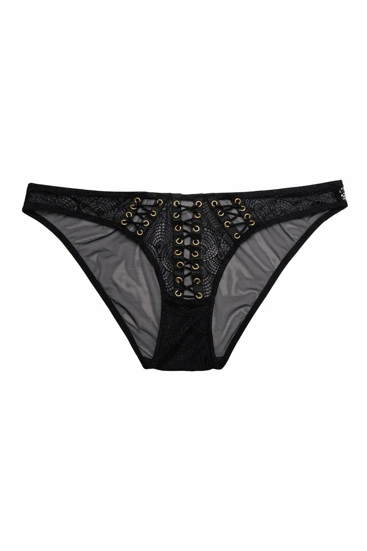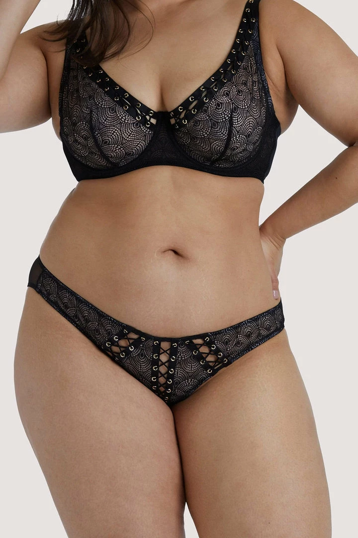 Lace-up your lingerie! The Florence set is for steamy nights. Geometric, circular lace is featured all over, which contrasts with the lace up detail on the front of the brief. The laces are made up from elastic string, perfect for getting your dream look.