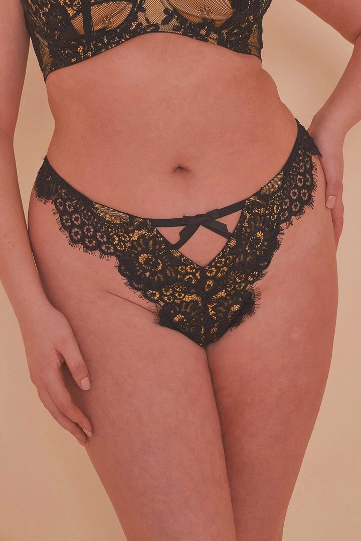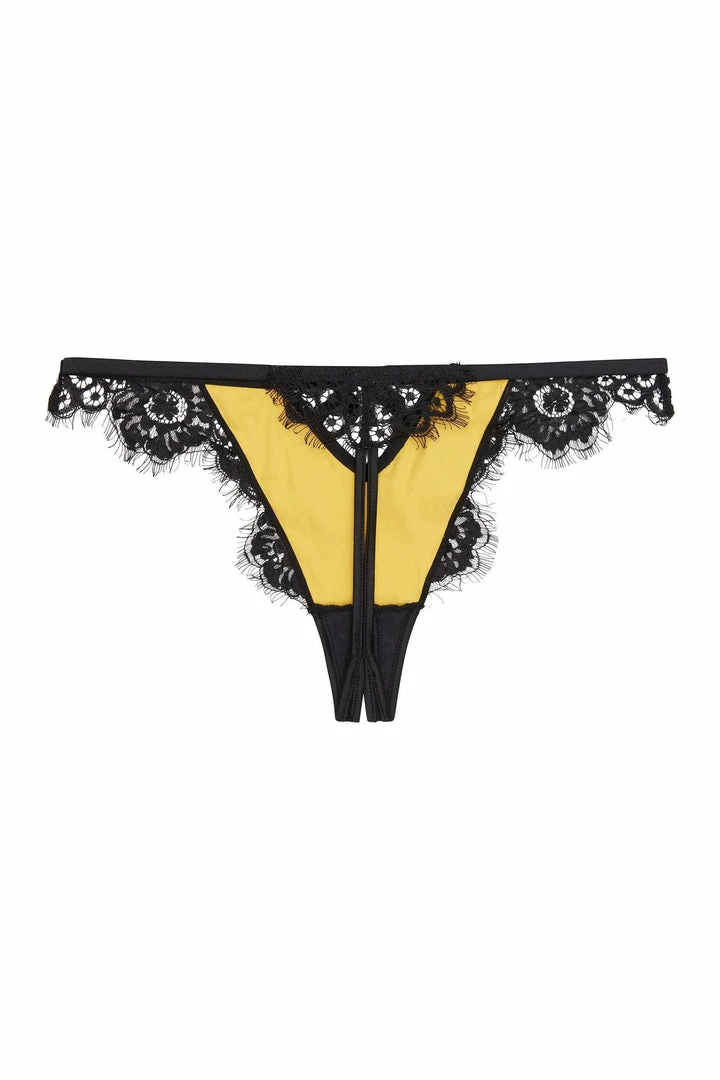 The Mustard Contrast Crotchless Thong features bold floral lace overlaying matte yellow satin. The thong is embellished with a black bow in the centre. The sunny-yet-sexy vibes of this set are sure to get you in a good mood!