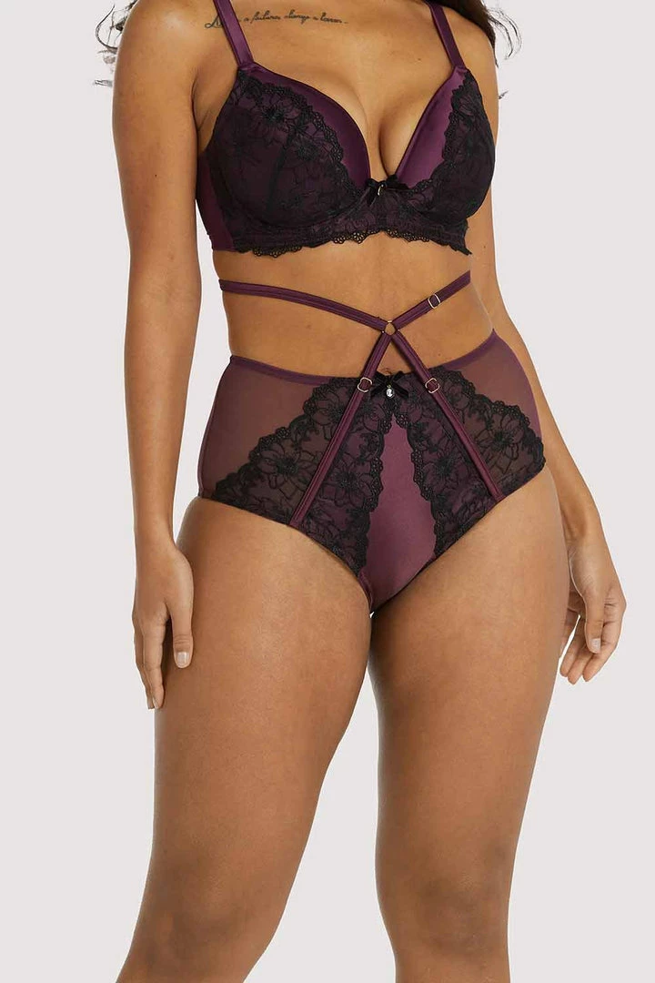 Dinner with wine? Why not pair dessert with the Muriel set, encased in rich red wine satin, corded floral lace mesh and the unique addition of a strap around the waist. The high waisted brief is a sophisticated addition to a seductive set.