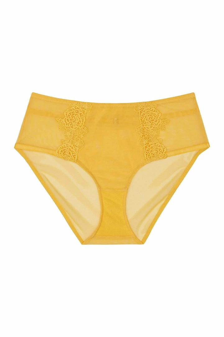 Vivienne will be the summer essential you’ve been waiting for! The high waist treat features applique lace and strap detail that can be worn at the front or back. Soft mustard mesh feels like pure, sunny heaven.