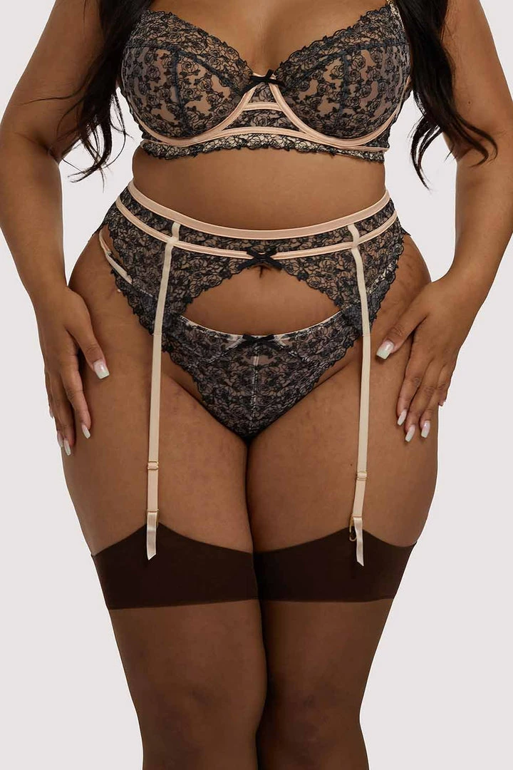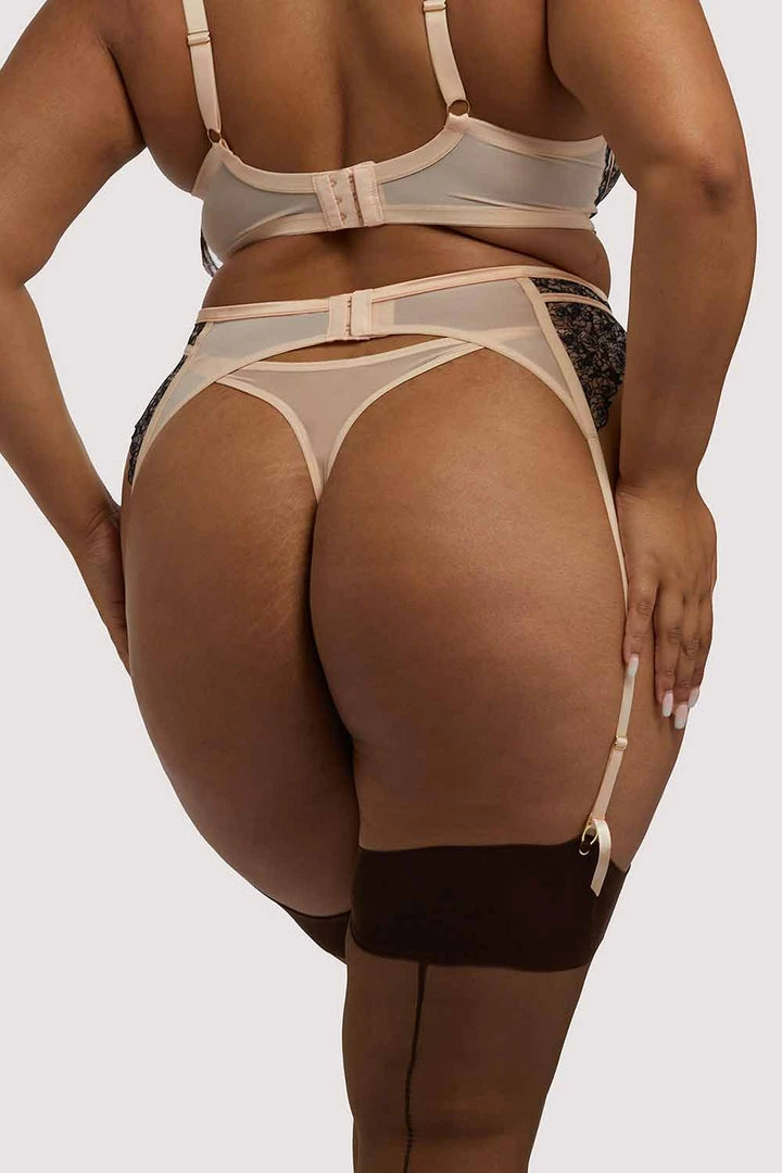 You’ll look blooming lovely in this. The Skull & Roses 4-strap supender features delicate rose embroidery on a light nude tulle with peach satin detailing and a black bow for a perfect finishing touch.