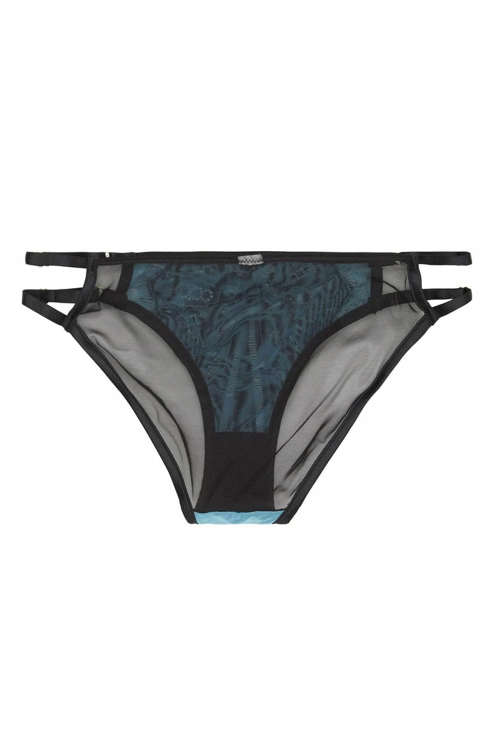 Feel dreamy in the Sky set! Sky-blue satin is encased with black fan-lace applique on the centre panel. Adjustable black satin straps embellish the sides of the brief, with gold O-ring detail. The back of the brief is complete with sheer black mesh.