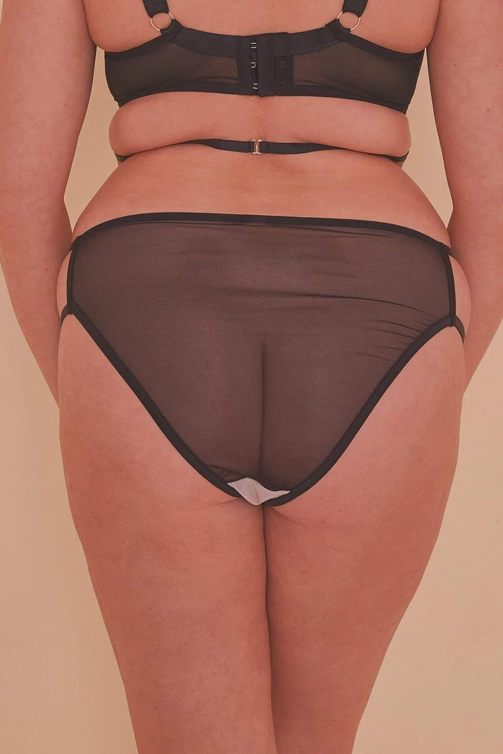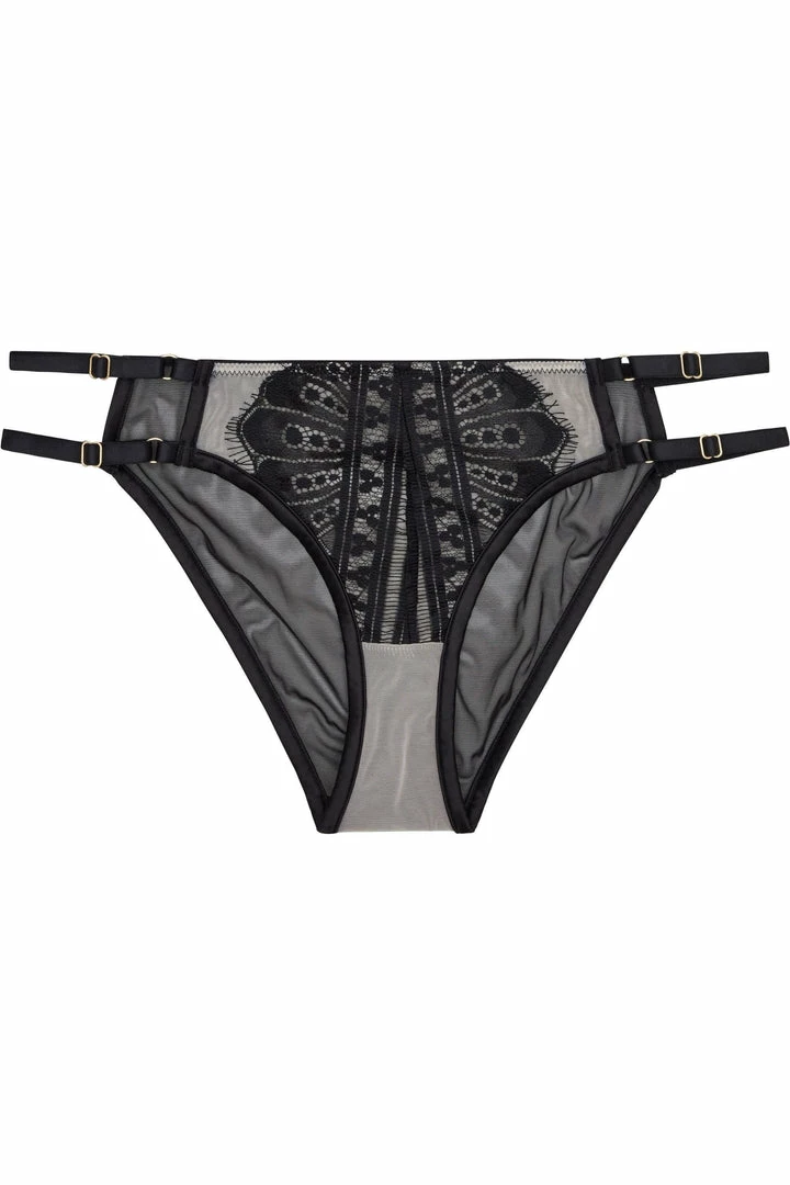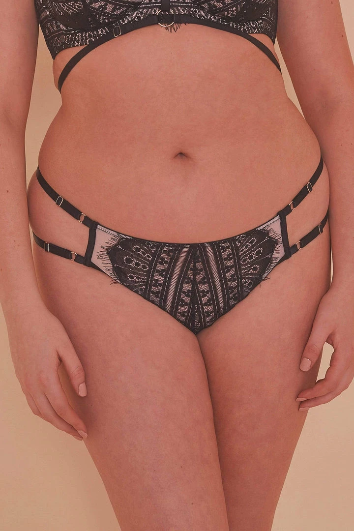 Feel dreamy in the Sky set! Peachy ivory satin is encased with black fan-lace applique on the centre panel. Adjustable black satin straps embellish the sides of the brief, with gold O-ring detail. The back of the brief is complete with sheer black mesh.