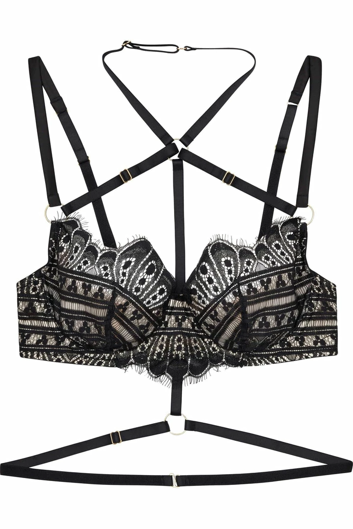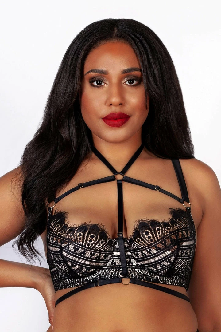 Feel dreamy in the Sky set! A peachy ivory satin is encased with black fan-lace applique, peeking over the quarter-cups and band. An adjustable black elastic harness acts as a choker and goes around the ribcage. The shoulder straps are adjustable, and the bra features a hook and eye closure at the back.