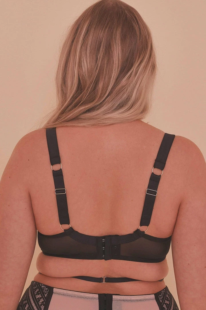 The curve bra features stronger mesh on the band and thicker straps for support.