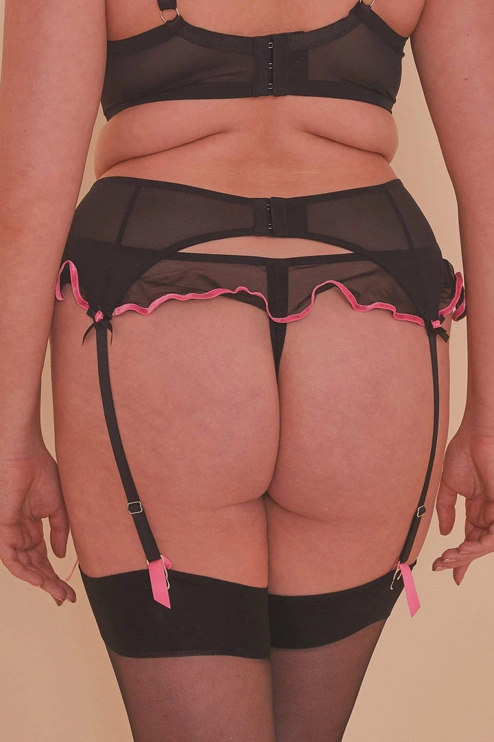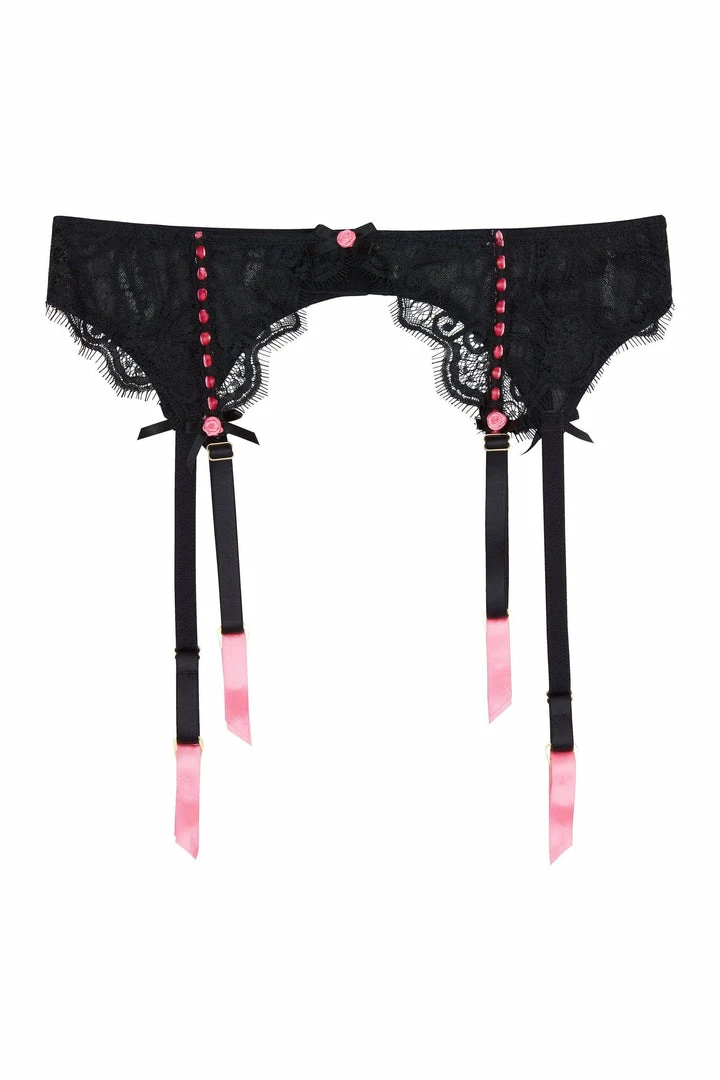 Meet your new lingerie-drawer staple! The Ribbon Slot set is a classic with its eyelash lace detail, mesh panels and hot pink ribbon slot detail. Each suspender strap is finished off with a perfect rose and bow embellishment.