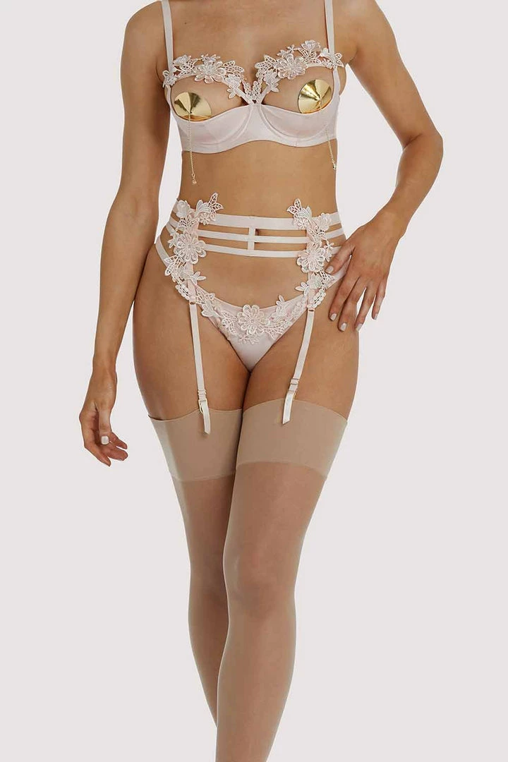 Exude elegant sensuality in the guipure suspender. Three peach satin elastic straps are embellished with applique lace over the suspender straps.