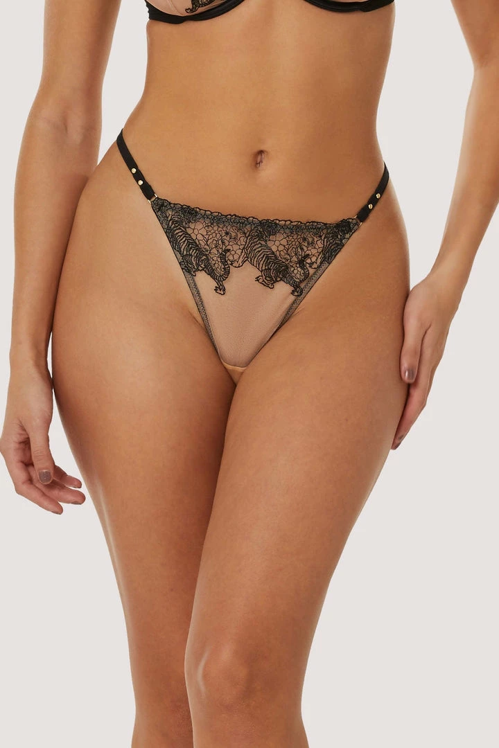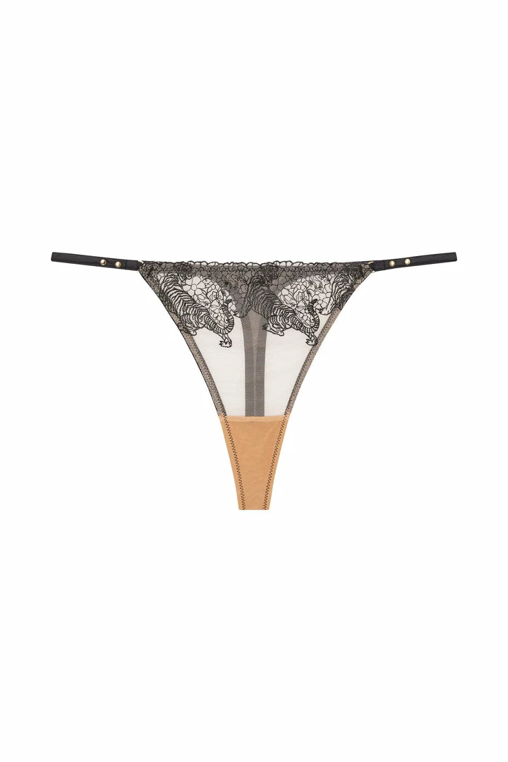 Grrr! Tiger is back… this time in Peach and Black. The thong features soft peach sheer mesh embroidered with black tigers and floral details at the front. Match with the Tiger Peach and Black Bra for the ultimate set.