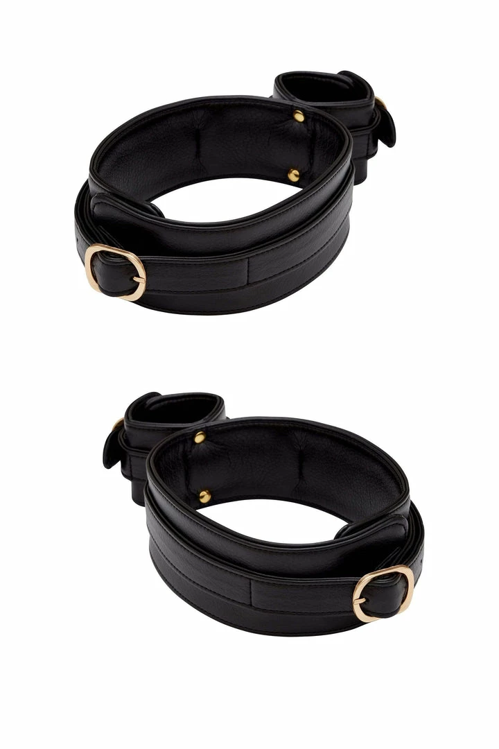 Adjustable to the wearer’s wrist and thigh using the gold buckles.