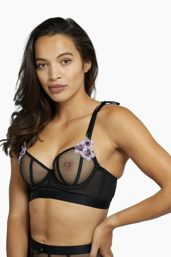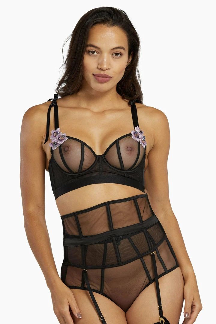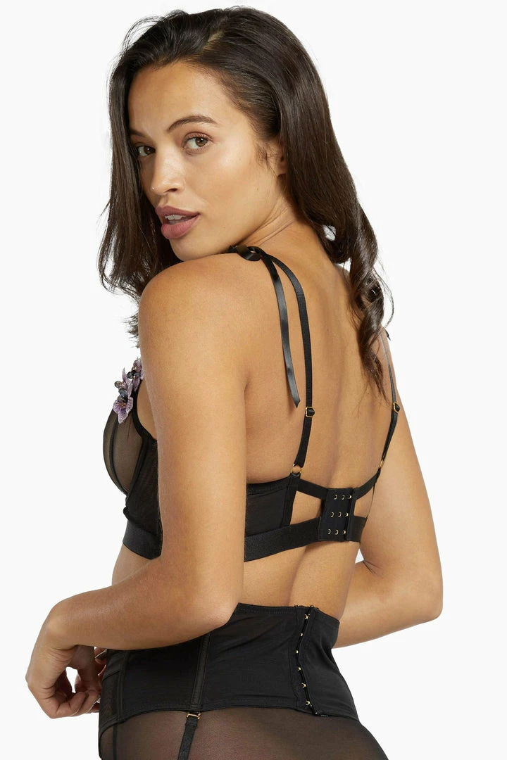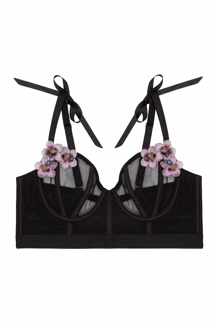 Live out your dark gothic fantasy in the Colette set. Sheer mesh panels contour your body in this longline bra with soft bow detail adorning the straps. On each cup is 3D clusters of flowers with gem embellishment for an added sparkle.