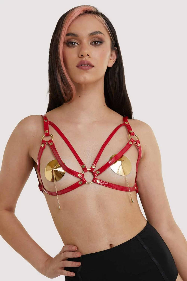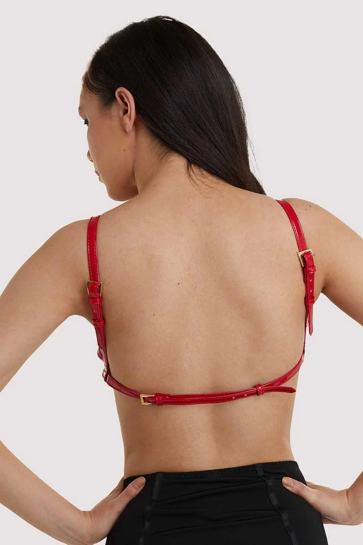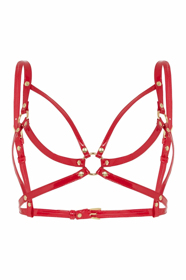 An open cup style harness bra that can be worn over anything looks stunning in this bright lipstick red.