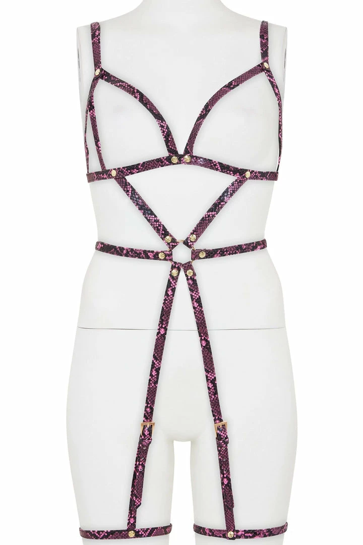 This sssssexy snakeskin open cup style harness only gets better with the extendable leg cuffs.