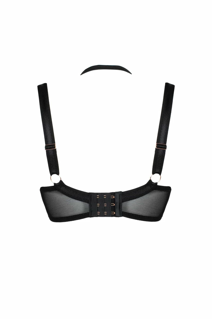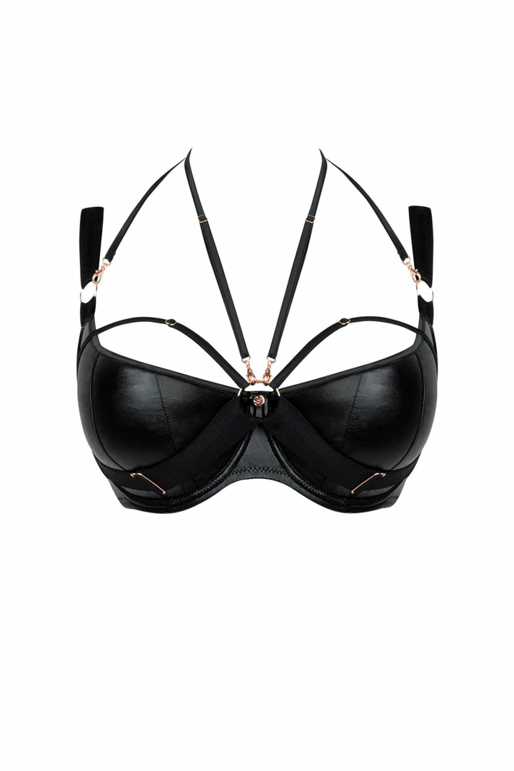 Scantilly by Curvy Kate Harnessed Padded Half Cup Bra. Scantilly’s most loved balcony shape returns with an even darker side. Harnessed steps up the bondage feel with a new, soft leatherette outer and stunning rose gold metalware throughout. The additional of removable satin strapped necklaces means endless harnessing options. Matching brief options available