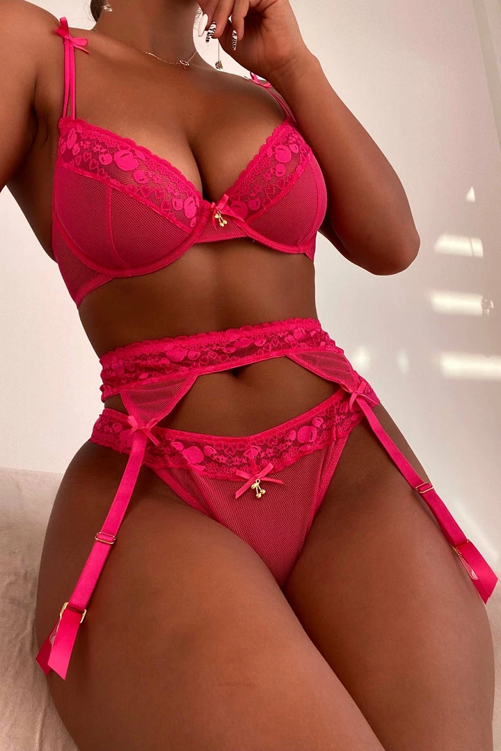 Be the cherry on top of the cake in our Jordan Bra….Made from hot pink mesh and cherry patterned lace this is the perfect cute but sexy bra for you. Finished with pink satin bows and a cherry charm in the centre. Match with our Jordan Brief and Suspender Belt for the full look.