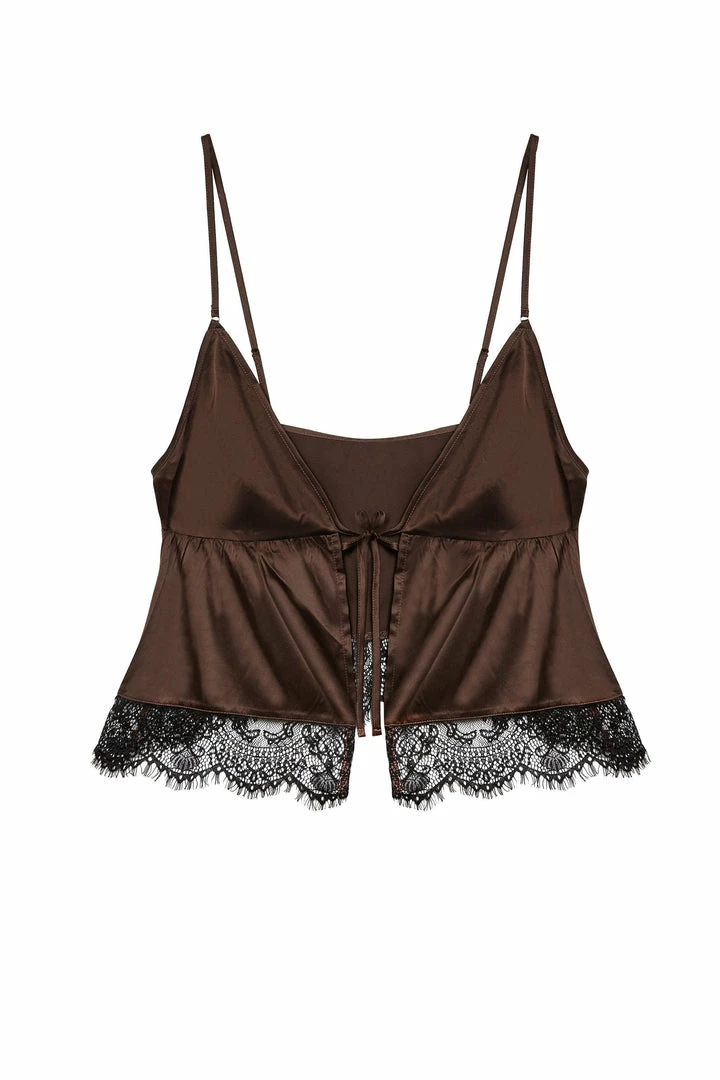 This beautiful Chocolate Lace Trim nightwear set features a tie up midsection and playful floral lace trimming. The ultra-smooth satin guarantees that these are both sexy and comfortable.