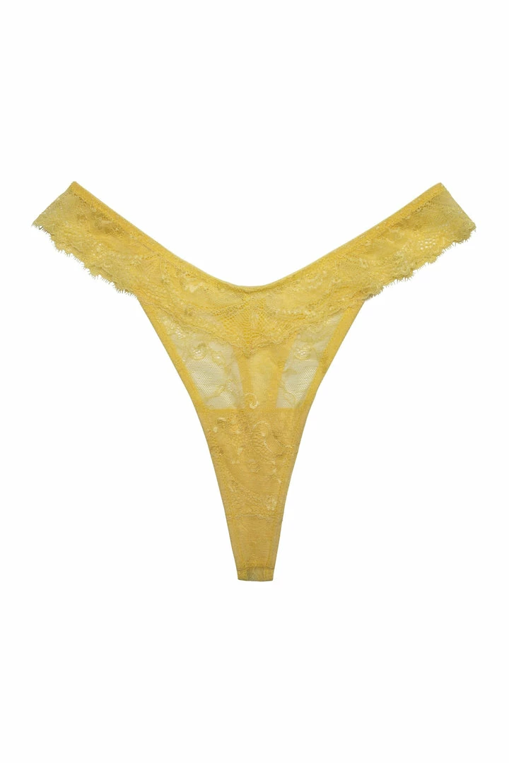 The Ariana lace thong in sunshine yellow. Ariana is back as a thong in a new luxurious lace, a new range of colours to add to your comfortable, everyday lingerie collection.