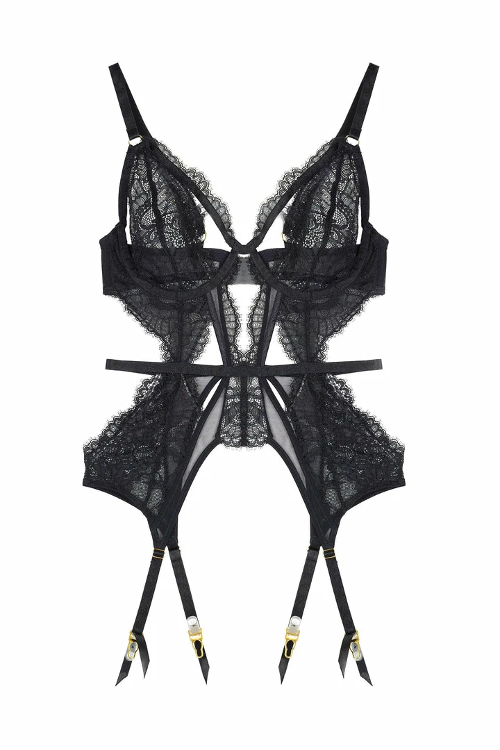 Accentuate and highlight your figure in the Ember! This basque features cut outs all over, lace panels and frilled edges, seductively revealing your curves. It features 4 suspender straps to keep your stockings in place.