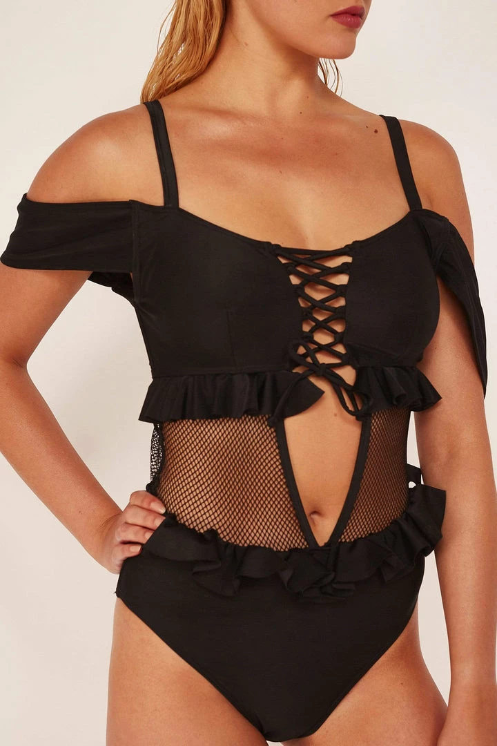 The hottest style this summer is here and it’s a one of a kind. Featuring a lattice tie front, fishnet panels, gathers galore, all eyes will be on you.