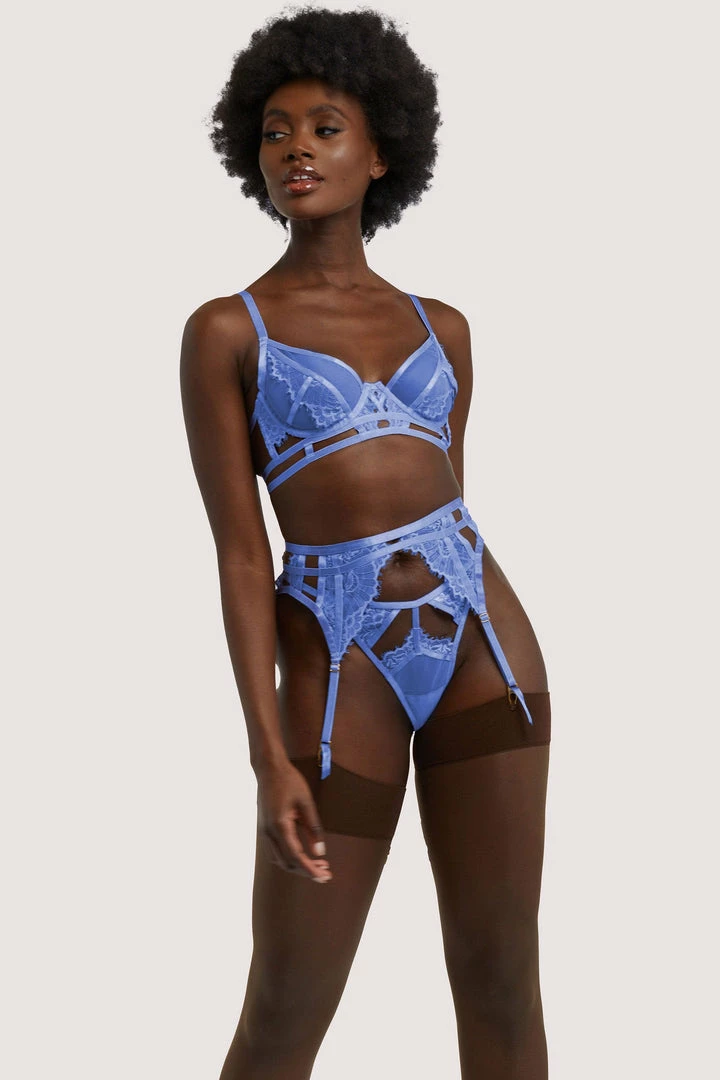 Stand out in Claire…The Claire Blue Caged Lace Thong features bright powder blue mesh cups with a delicate lace overlay, the elastic caging adds extra sexiness whilst still being comfortable. Match with the Claire Suspender Belt and Bra for the ultimate set.