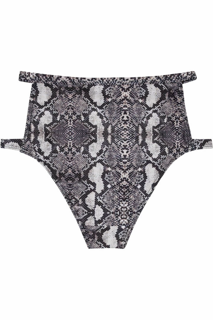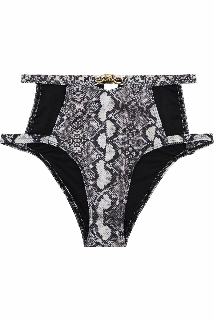 Ssss seriously cool. This fun snake print chain high waist brief is a must have. The chain detailing along the waist band, and the cut-out details at the waist bands are key features and make this style effortlessly cool. Pair with the matching snake print range.