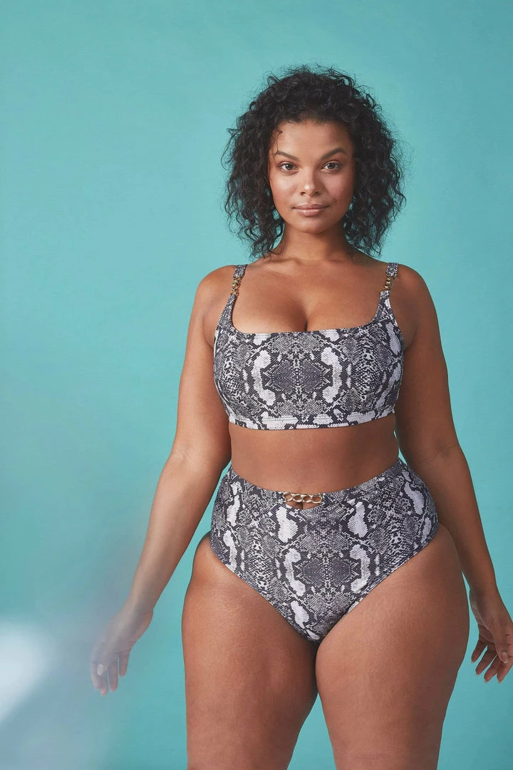 Ssss seriously cool. This fun snake print brief is a must have. Sitting high on the waist, the full coverage brief has a gold chain and cut out feature in the centre front. Pair with the curve snakeskin crop top.