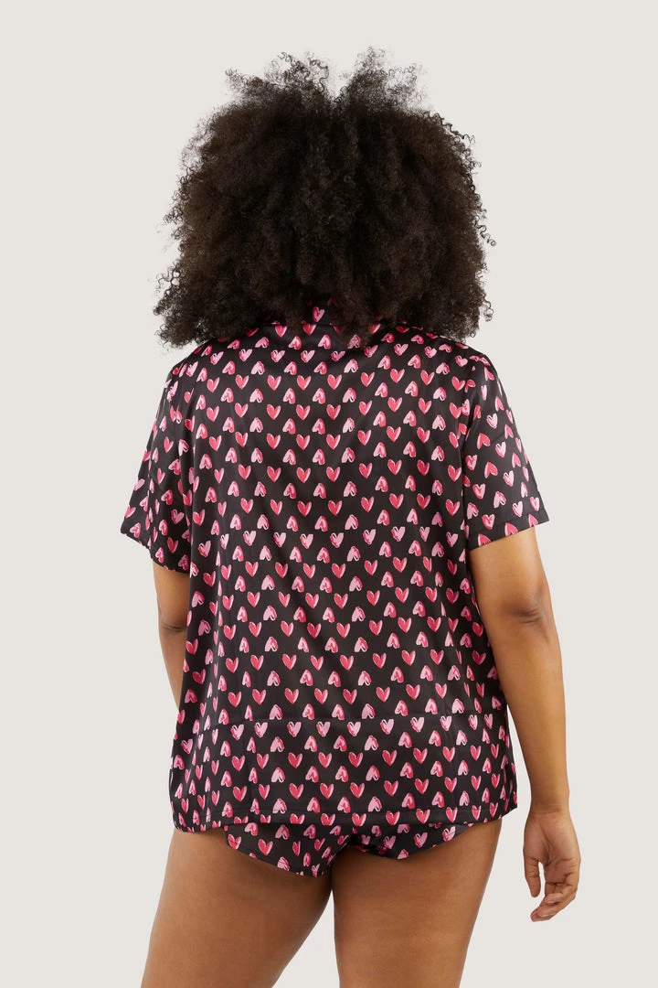 Get cozy in our Heart Print Satin Pyjama Set. Totally dreamy, our short and shirt set is designed in super soft heart print satin. This is the perfect set to end your night.