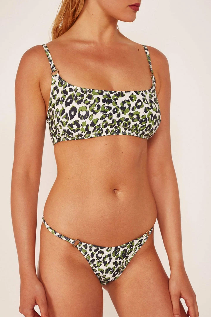 This simple yet fun khaki leopard brazillian brief has a sporty vibe across the set.